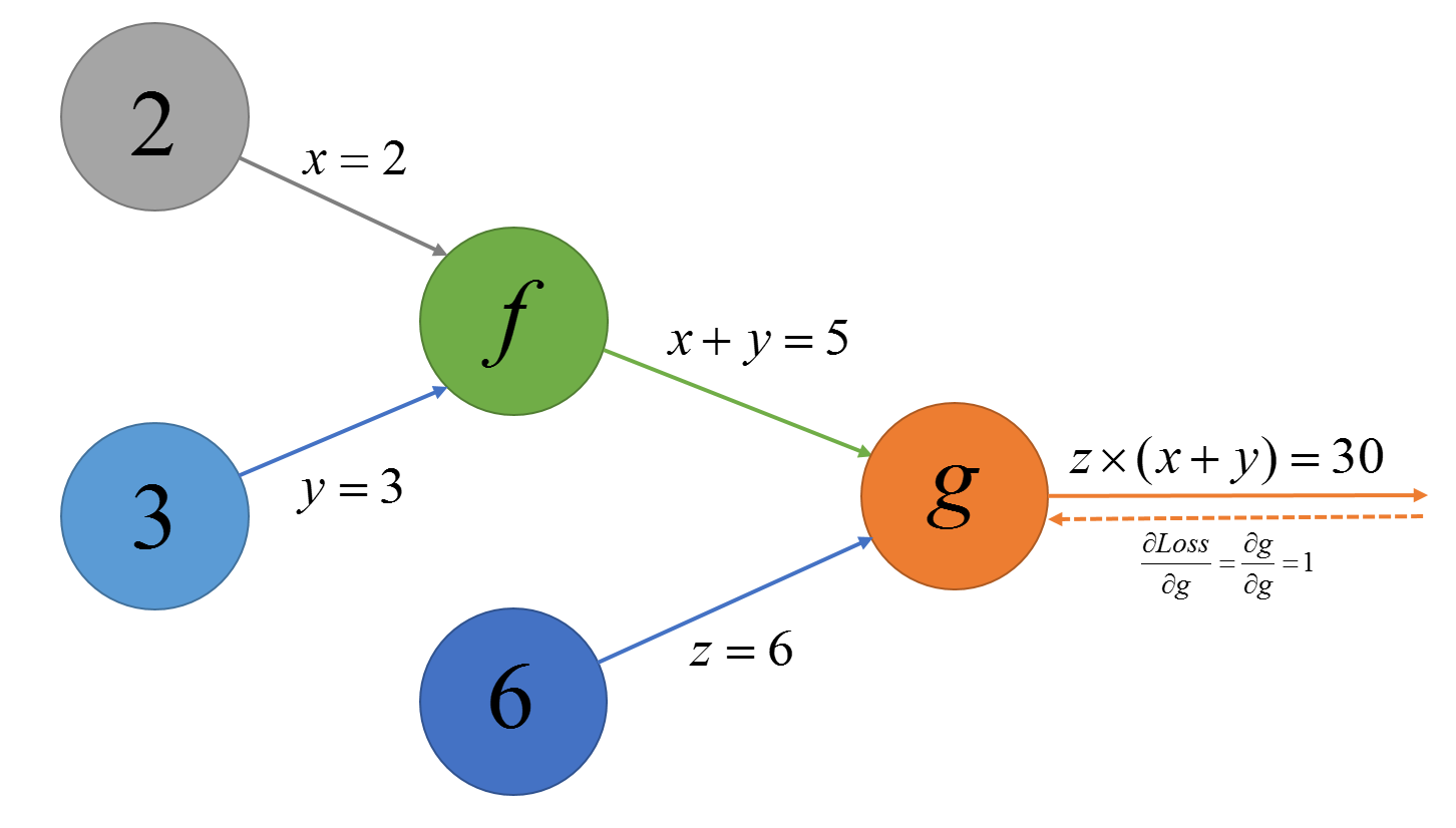 $\frac{\partial g}{\partial f} = z = 6$ (当然也可以计算出$\frac{\partial g}{\partial z} = x + y = 5$). 进而求出$\frac{\partial Loss}{\partial f} = \frac{\partial Loss}{\partial g}\frac{\partial g}{\partial f} = 1 \times z = 6$
